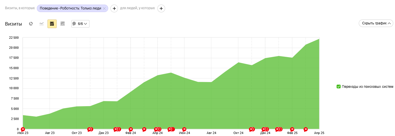 Развитие экспертного информационного раздела. Последовательная публикация статей, охватывающих как высокочастотные, так и узкоспециализированные темы, усилила экспертность сайта и способствовала привлечению органического трафика на ранних этапах воронки.